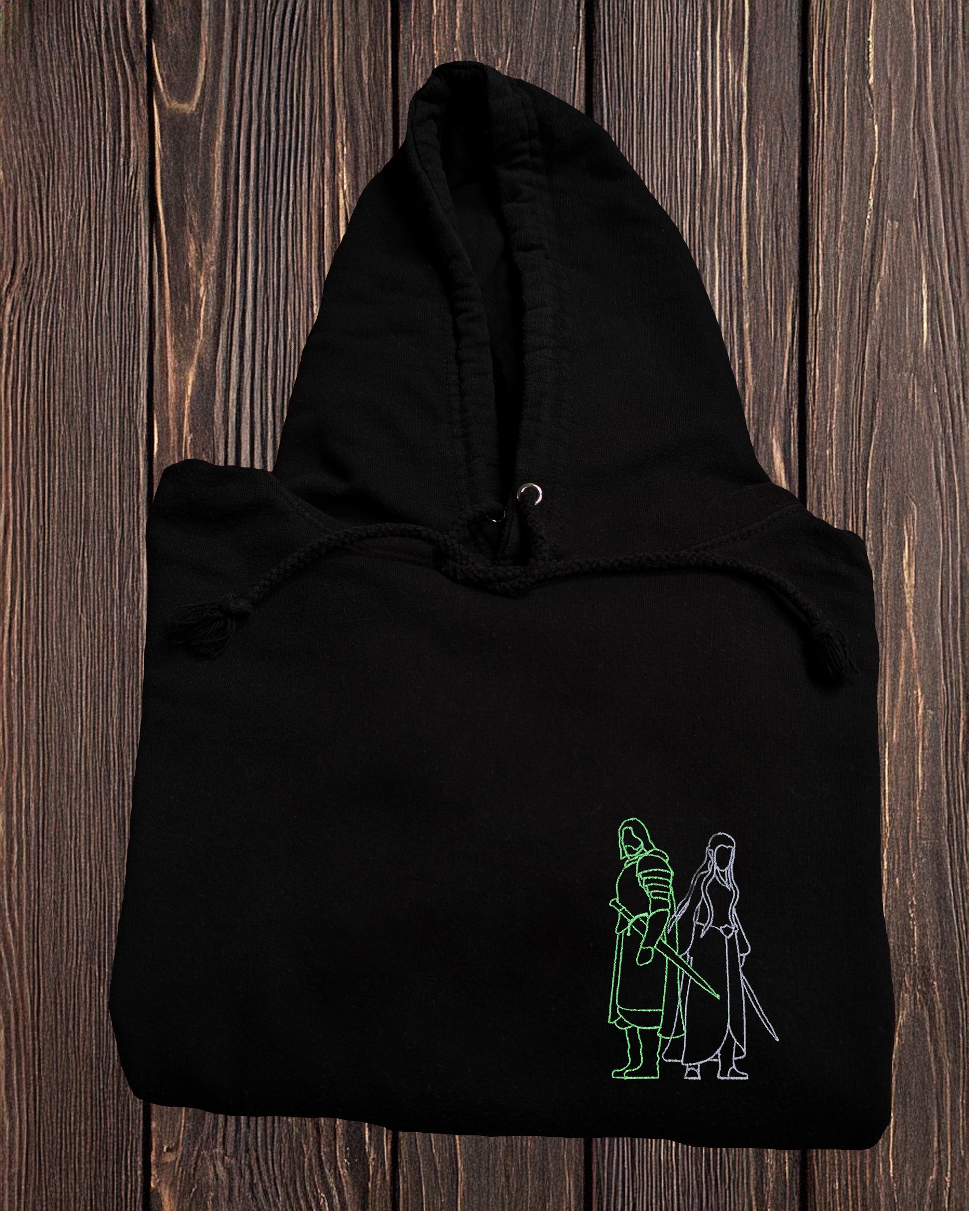 Inspired by one of the greatest love stories ever told, this design captures the quiet strength of a wandering king and the enduring light of his elven queen. Stitched in clean, minimalist outlines, it’s a subtle nod for those who know the tale - timeless, bold, and full of meaning.