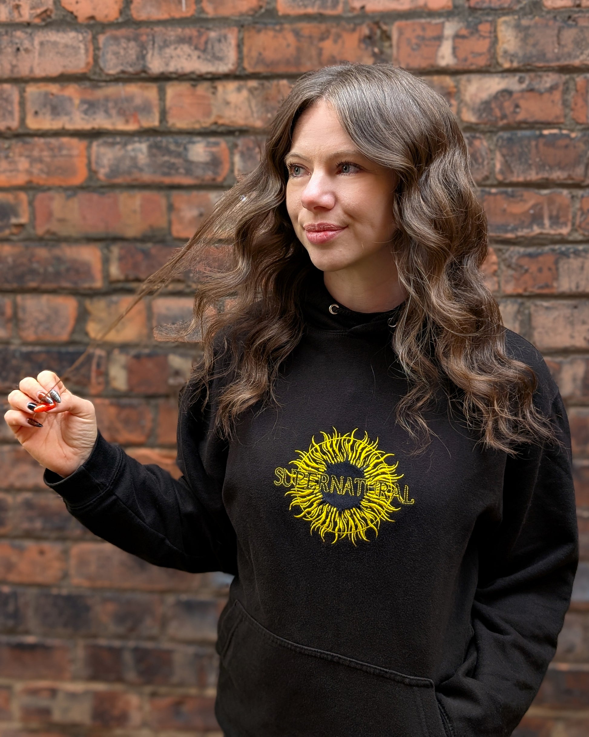Crafted on a classic hooded jumper, the design blends supernatural symbolism with clean, minimal style - making it the perfect wearable for long time hunters who’ve been there since the pilot, or new fans just joining the road so far.